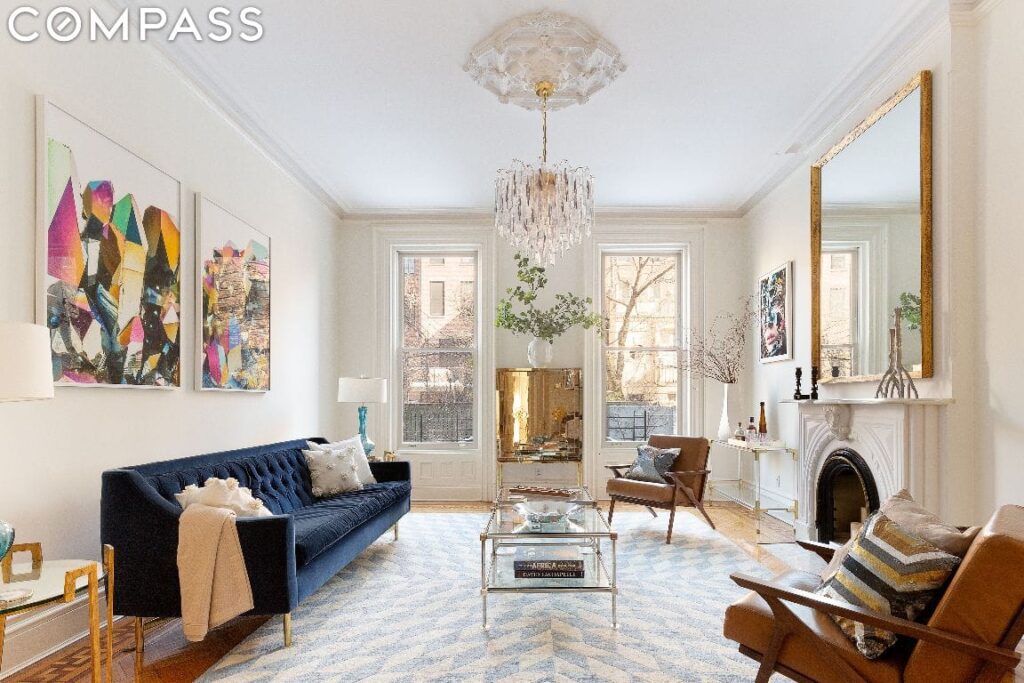 The parlor level boasts soaring ceilings almost 11 feet high and decorative inlaid hardwood floors throughout. The living room opens through a bold arch with original pocket doors and is a gorgeous space for entertaining. The oversized room has an impressive feel with a lavish plaster medallion and chandelier, marble clean burning fireplace, and large windows overlooking the private garden. The formal dining room has another marble fireplace mantel and original plaster medallion, millwork and hand laid flooring. The previous owners created a library with custom display bookcases that separates the dining and living spaces, providing an additional seating and entertaining space.