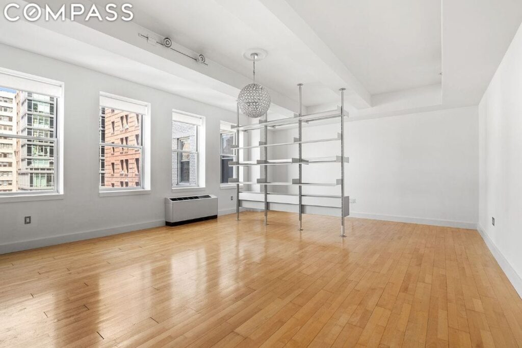 A gracious entry foyer leads you into the sparkling north facing great room featuring 5 windows and a wall of designer Vitsoe shelving delineating part of the space for a home office or even a second sleeping space (can also be removed upon request). This massive 30×20 space is open to a sleek kitchen with plentiful Bulthaup cabinetry and a suite of Miele appliances including a brand new dishwasher.