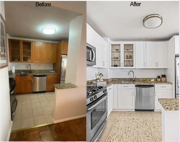 At our recent listing in Flatiron, we opted to spend 10K on furnishings with a professional stager, rather than refinish the floors and the closets, which will absolutely need to be addressed. The cost to do either could have been similar, and the furniture is only temporary so while it may seem like a less practical choice, the staging still has a much more dramatic effect, allowing buyers to envision themselves there. That fresh coat of paint is always a game changer. And here, the most transformative part of the prep here was painting the kitchen cabinets from their original natural wood finish. While the countertops and everything remained the same, buyers could now perceive it as move-in-ready without renovation. And sure enough we are signing a contract now after only a few days of showings in the $1.4Ms, We estimated the price at $1.2M if he had opted not to do the staging.